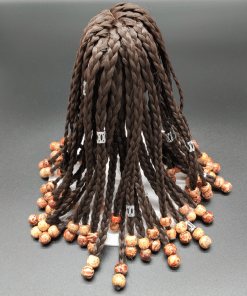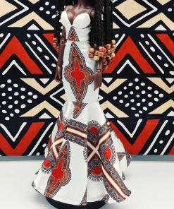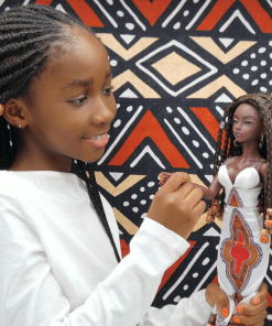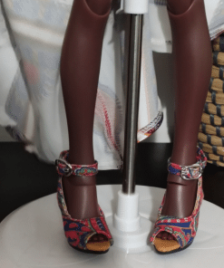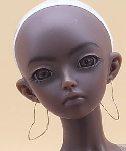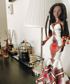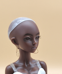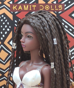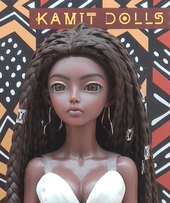 Kadee est une poupée artistique BJD (Ball Jointed Doll) de collection de couleur noire. Elle est en résine de polyuréthane (plastique dense), elle mesure 40 cm de hauteur. Elle a 13 points d’articulation qui lui permettent d’imiter presque tous les mouvements humains. Elle porte une perruque (wig) tressée et décorée de perles et de bagues argentées pour cheveux. Elle porte une robe dashiki, des chaussures ethniques et des boucles d’oreilles dorées en forme de coeur.